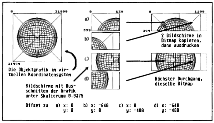 Es muß nun noch die erzeugte Bitmap, welche einen Teil der Grafik enthält, zu Papier gebracht werden. Die Routinen stellen hierzu die gewünschte Druckdichte ein und lesen die Bitmap entsprechend dem gewählten Drucker byteweise aus. Bei einem 24-Nadler müssen so bei 180 dpi jeweils 24 Zeilen ausgelesen und Bit für Bit auf die Nadeln „geschickt“ werden, bei 90 dpi sind es nur zwölf Zeilen auf jede zweite Nadel, bei einem Laser geschieht die Belichtung dagegen rein byte- und zeilenweise.