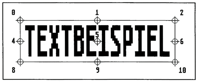 Übergabeparameter sind das VDI-Handle handle (oder 1, s.o.), die Position der Grafik (x_pos, y_pos), der Rotationswinkel in 1/10 Grad (angle, nur 90 Grad-Schritte möglich), die Sollbreite width des Textes (width>0: Breite des gesamten Textes, width<0 Breite eines Zeichens), die Sollhöhe height und der Text selbst als Zeiger auf einen String (text). Der Bezugspunkt hot gibt die Positionierung des Textes relativ zu dessen Platzbedarf an, siehe Bild 3.