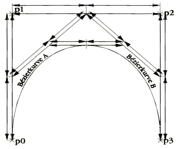 Betrachtet man sich in Programmen wie Outline Art eine BĂ©zier-Kurve in der VergröĂerung, so ist festzustellen, daĂ diese in mehrere Linien unterteilt ist. Die Anzahl der Linien ist immer eine Zweierpotenz, was wohl, wie sich heraussteilen wird, weniger ein Zufall ist. Die BĂ©zier-Kurve lĂ€Ăt sich nĂ€mlich durch ein einfaches baumstrukturartiges Halbierungsverfahren, also vorzugsweiserekursiv, âberechnenâ (es gibt nichts Schöneres als Re-kursionen und binĂ€re BĂ€ume). Man kann sie auch iterativ berechnen, was jedoch um einiges langsamer und weniger elegant ist.