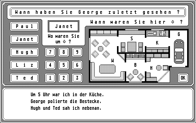 Um Licht in die düstere Angelegenheit zu bringen, können Sie die fünf Verdächtigen, Paul, Janet, Hugh, Liz sowie Ted, befragen: wann sie George zuletzt gehen haben oder wann sie sich wo aufgehalten haben. Die Fragen werden dabei durch Anklicken der Uhrzeit odereines Wohnbereiches im Grundriß gestellt. Je nach Laune des Befragten erhält der Detektiv knappe oder auch recht ausführliche Antworten und Hinweise. Doch der Mörder lügt natürlich. Sofern Sie nach einigen Interviews der Meinung sind, den