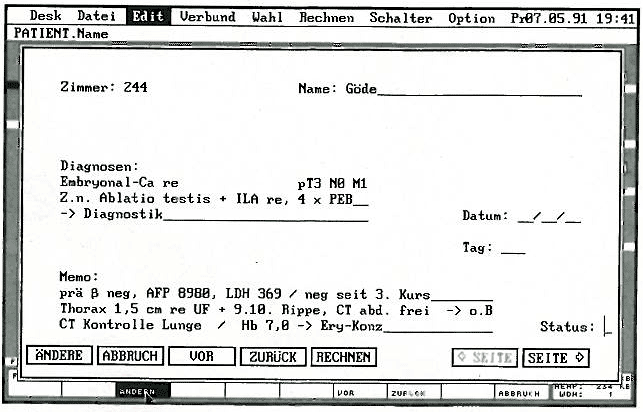 Für die Urologische Station mindestens genauso relevant wie die eben beschriebenen Einsatzfelder ist der ST in seiner Funktion als Terminal für einen DEC PDP 11/83-Großrechner. Auf diesem Rechner befindet sich das Tumorregister der Station, d.h. eine umfangreiche Datenbank über die behandelten Tumorpatienten. Durch Verknüpfung bestimmter Datenfelder (z.B. Patientenalter und Tumorart) lassen sich Erkenntnisse über eventuelle Zusammenhänge gewinnen, die man allerdings erst nach statistischer Auswertung großer Patientenzahlen erkennen kann. Diese statistischen Auswertungen geschehen dann auch auf dem Atari, nachdem man sich vom Terminalprogramm aus die Zahlen auf die Atari-Festplatte überspielt hat. Da diese Einsatzmöglichkeiten bereits in anderen Artikeln ausgiebig besprochen wurden, möchte ich nicht näher darauf eingehen.