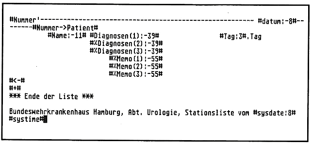 Als überzeugter Computerfan macht man so etwas natürlich nicht lange mit. und so dauerte es auch nicht lange, bis Dr. Dettmann eine entsprechende Eingabemaske für Adimens entworfen hatte (s. Abb. 1). Für die Ausgabeliste. in der die Patienten nach Zimmern geordnet ausgedruckt werden, ist die in Abb. 2 abgebildete ".DOC“-Datei mit einem ASCII-Editor zu erstellen. Damit die prä- bzw. postoperativen Tage automatisch hochgezählt werden, muß unter dem Adimens-Menüpunkt „Rechnen“ [Tag]=[SYS-DATE|-[Datum]+1 eingegeben werden.