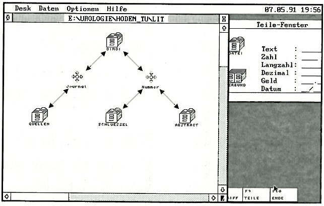 Nun wäre es sicherlich vorteilhaft, die einmal bezahlten Daten in die eigene Datenbank zu übernehmen, so daß man auch später noch einmal darauf zurückgreifen kann. Dazu muß man das Datenformat der DIMDI-Daten auf das der eigenen Datenbank umformatieren. Dr. Dettmann entwickelte also ein Programm, das diese Aufgaben bezüglich Adimens erledigt.