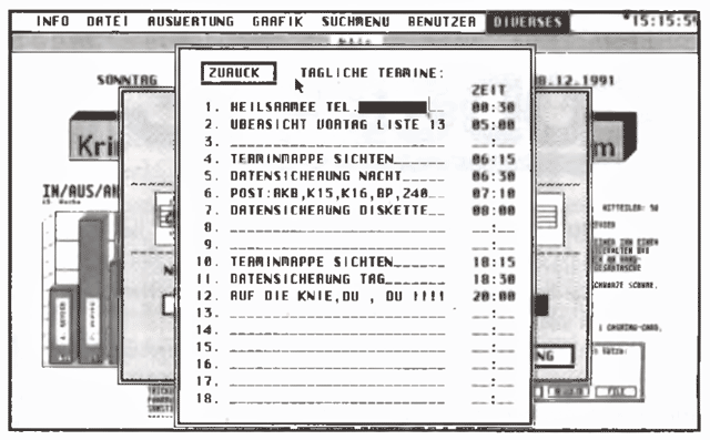 Eine Reihe von Arbeiten sind im Lagedienst turnusmäßig zu erledigen. Damit in Streßsituationen sowie bei Arbeiten mit abgesenkter Leistungskurve (Nachtdienst) kein Termin verlorengeht, wurde klis mit einer Terminüberwachung ausgestattet. Programmtechnisch ließ sich diese Funktion problemlos und sicher mit den Every-Befehlen des GFA BASIC realisieren. Dialog-Formulare verwalten jährliche, wöchentliche und tägliche Termine (siehe Bild 6).