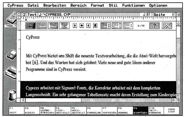 Mit CyPress bietet uns Shift die neueste Textverarbeitung, die die Atari-Welt hervorgebracht hat [6|. Und das Warten hat sich gelohnt: Viele neue und gute Ideen anderer Programme sind in CyPress vereint.