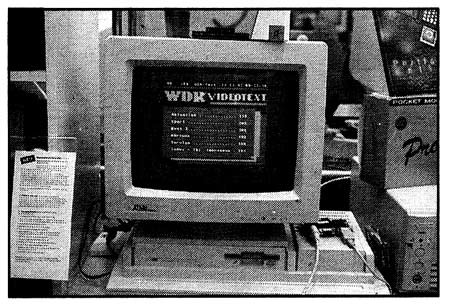 Eine Kostprobe in Sachen BTX und Videotext konnte man bei Drews bekommen. Der bekannte BTX-Manager liegt in einer neuen Version vor. Auch Videotext bleibt den ATARI-Benutzern nun nicht mehr verschlossen. Mit einer kleinen Hardware, die Anschluß an einen handelsüblichen Videorekorder mit FBAS-Ausgang findet, und dem entsprechenden Programm ausgerüstet, lassen sich alle bekannten Videotextdienstleistungen der Rundfunkstationen abrufen.