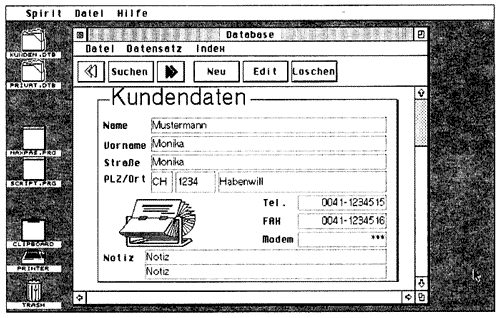 Mit Spirit stellte MAXON eine neue Datenbank vor, die Leistungsvielfalt und einfache Bedienung vereinen soll. In der Tat zeigte sich Spirit mit durchdachter Benutzerführung, so daß ein Anwender ohne lange Übung mit dem Programm arbeiten kann. Im Kern besteht Spirit aus einer äußerst schnellen und plattenorientierten Datenbank, die keinerlei Datensatzbeschränkungen aufweist. Das Ändern der Maske bzw. das Erweitern von Datenfeldern ist jederzeit möglich und geht ohne größere Wartezeit vonstatten. Mit Spirit lassen sich sehr bequem Masken verschiedenster Art erstellen, Knöpfe und Grafiken einfügen. Die Oberfläche arbeitet neben dem üblichen Bildschirmzeichensatz mit ATARI-GDOS-Fonts, bietet also proportionale, sehr ansprechend aussehende Zeichen auf dem Bildschirm. Spirit bietet die Möglichkeit des Rechnens in Feldern, auch Vergleichsoperationen, bedingte Rechnung und String-Operationen. Ein Reportgenerator sorgt für die passende Ausgabe der Daten, ein integrierter Editor dient u.a. für Serienbriefe. Spirit arbeitet als Programm und Accessory, wodurch Anwender sofort auf Daten zugreifen können. Spirit wird Mitte dieses Jahres erscheinen.