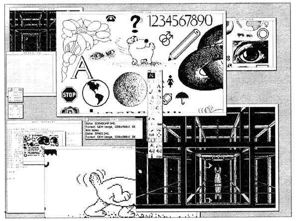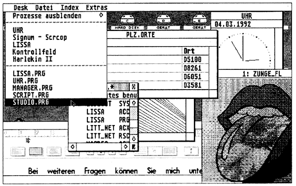 Auch in diesem Jahr hatte MAXON wieder einen eigenen Stand, der sich ganz in der Nähe des ATARI-Standes befand. Bei MAXON konnte man sich die Produkte MulitGEM II. ACS, Harlekin II, Spirit und Outside teilweise von den Programmierern persönlich vorführen lassen. Mit MultiGEM II ist ein weiterer großer Schritt in Richtung voller Multitasking-Fähigkeit getan worden. Es besteht nun keine Beschränkung mehr in der Anzahl der ladbaren Programme oder Accessories; 10 Programme und 8 Accessories wären z.B. durchaus möglich, sofern der Arbeitsspeicher für eine solche Anzahl von Anwendungen ausreicht. Aktive Prozesse können per Mausklick ausgeblendet, also für den Benutzer unsichtbar gemacht werden, ohne daß sie dabei aus dem Speicher entfernt werden. Beim Ausblenden werden alle GEM-Fenster, die zu diesem Programm gehören, geschlossen und der Prozeß aus dem Multitasking ausgeklinkt. Natürlich kann man jederzeit ein solches „schlafendes“ Programm wieder einblenden, wobei alle Fenster wieder geöffnet werden und sich exakt so darstellen wie vor dem Ausblenden.
