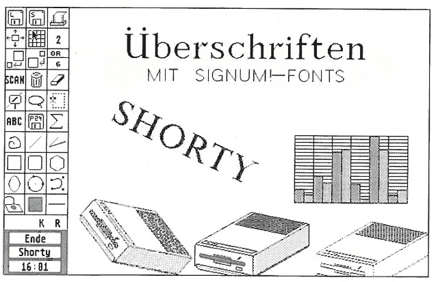 Ein Zeichenprogramm und Accessory, das insbesondere für die Zusammenarbeit mit SIGNUM!2 und SIGNLUM!3 konzipiert ist, ist in der Sonderdisketten-Serie von MAXON erschienen. Das Accessory läßt sich aus SIGNUM! auch direkt mit F6 aufrufen. Neben umfangreichen Grafikfunktionen bietet SHORTY einen virtuellen Großbildschirm inkl. Übersichtsmodus (max. 2560x1600 Pixel), zahlreiche Pufferfunktionen (z.B. Lasso, stufenloses Drehen), Schreiben mit max. drei SIGNUM!-Zeichensätzen, Vielecke, Echtzeitlupe, Raster, Snap und Biegelinie. In dieser neuen Version unterstützt SHORTY STAD-, Screen-, SIGNUM!- und IMG-Format.