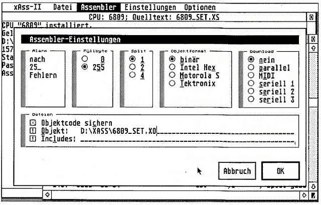 Wer mit seinem Atari eine andere CPU als den 68000 programmieren möchte, benötigt dafür einen Cross-Assembler. In der Version 2.0 erscheint nun xAss-II, ein Cross-Assembler, der nicht auf eine bestimmte Ziel-CPU festgelegt ist. Mit Hilfe von ASCII-Tabellen, deren Format im Handbuch dokumentiert ist, läßt sich die Ziel-CPU definieren. xAss-II ist mit einer komfortablen GEM-Oberfläche ausgestattet, die auch auf Overscan- und hochauflösenden Bildschirmen arbeitet. Die Dialoge sind komplett maus- und tastaturbedienbar. Der leistungsfähige Assemblerteil bietet eine Include-Direktive, Makros mit Parameterübergabe sowie bedingte Assemblierung. Hierarchische Arithmetik, beliebig lange Bezeichner für Variablen und Adressen und Direktiven für Speichermanipulation runden den Assemblier-teil ab. Nach der Assemblierung kann der Objektcode wahlweise im Binär-, Motorola-S-, Intel-Hex- oder Tektronix-Format abgespeichert werden. Außerdem kann man ihn auch an einer der Standardschnittstellen (Centronics, RS 232, MIDI) ausgeben, um ihn z.B. in einem EPROM-Simulator zu laden. So ist schnelles Testen und Ändern der Programme möglich.