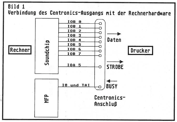 Worin besteht die Aufgabe dieser Funktionen? Da das Prinzip der Centronics-Ausgabe schon mehrfach beschrieben wurde, unter anderem auch in [4], soll der Vorgang hier nur kurz Umrissen werden. Wird ein Byte an den Drucker abgeschickt, legt das TOS dieses Datum zunächst an den B-Port des Soundchips an, der direkt mit den acht Datenleitungen der Druckerschnittstelle verbunden ist. Durch einen kurzen LOW-Impuls an Bit 5 des A-Ports im Soundchip wird dem Drucker über die STROBE-Leitung signalisiert, daß nun ‘Arbeit’ auf ihn zukommt. Der Drucker quittiert diese Aufforderung sofort mit einem HIGH-Pegel an der BUSY-Leitung, welche ihrerseits mit den Eingängen 10 und TAI des MFP-Bausteins verbunden ist. Wenn der Drucker das Zeichen verarbeitet hat, legt er diese Leitung wieder auf LOW- Pegel, und der ATARI weiß, daß er ihm das nächste Zeichen senden darf. Bild 1 zeigt, wie die Parallelschnittstelle intern mit der Hardware des ATARI verbunden ist.