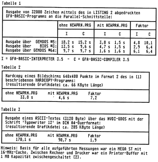 Im Falle des GFA-BASIC (Tabelle 1) sind die Werte für den Interpreter und die für den Compiler angegeben. Im Interpreter entfällt nämlich mehrZeit auf die Abarbeitung der Schleife als auf den eigentlichen Druckvorgang. Das Benchmarkprogramm steht in Listing 2. Wer das Programm auf seinen Drucker loslassen möchte, sollte zweierlei beachten: Einmal muß das Programm NEWPRN.PRG auf der gleichen Directory-Ebene liegen wie das Benchmark-Programm, und es darf vorher noch nicht gestartet worden sein. Zum anderen macht es nur Sinn, wenn der verwendete Drucker einen genügend großen Buffer (mindestens 192 KByte) hat. Bei Druckern mit weniger Buffer muß man die getestete Datenmenge (32000 Byte) entsprechend vermindern.