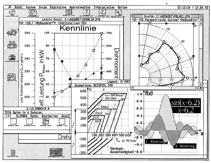 Aber zuerst einmal der Reihe nach: Was versteht man überhaupt unter einem Auswerte-Programm? Am besten erklärt man den Unterschied zu einem Business-Programm (z.B. K-Graph, Sci Graph) und einer Tabellenkalkulation, wobei die heutigen Tabellenkalkulationen bereits einen Business-Teil (Grafikteil) beinhalten. Business-Programme stellen vorgegebene (Meß-)Daten grafisch in ansprechender Form dar, d.h. die Grafik muß nachher in bester Qualität auf Papier präsentiert werden, daher auch Präsentationsgrafik. Werden die Daten interpoliert oder approximiert (was meist nur in beschränktem Umfang möglich ist), so werden die Kurven zwar auf dem Bildschirm dargestellt, sie liegen aber nicht, wie bei einem Auswerte-Programm, in Weltkoordinaten vor. Ein in Weltkoordinaten arbeitendes Programm hält ständig mehrere Kurven (Graphdaten), Meßreihen, Glättungsparameter usw. als REAL-Werte (bei DATA mit 19 Stellen) im Speicher, so daß z.B. mathematische Manipulationen auch im Nachhinein noch möglich sind. Ein Auswerte-Programm sollte die Möglichkeiten eines Business-Programms (z.B. Vektor-Grafik, publikationsreife Grafik usw.) und die einer Tabellenkalkulation (z.B. Datenmanipulation. mathematische Berechnungen usw.) miteinander verbinden und zusätzlich in Weltkoordinaten arbeiten.