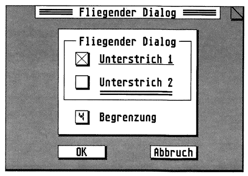 Oft sieht man in professionellen Programmen Dialoge, die mit ankreuzbaren Rechtecken, Linien, Unterstrichen und vielen Effekten mehr ihr Outfit verbessern. Der enthusiastische ST-Programmierer neigt natürlich dazu, seine Machwerke mit ähnlich akribisch gemachten Dialogen zu schmücken, greift eventuell zum Resource Construction Set und erlebt spätestens da eine böse Überraschung: