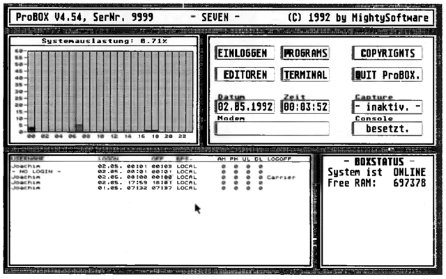 Die ProBox bietet auch die Möglichkeit, externe Programme einzubinden. Eine dokumentierte Schnittstelle ist in der Dokumentation zu finden. z.Z. gibt es nur ein paar externe Programme, wie z.B. Eliza, Lebenserwartung und Biorhythmus: also eher etwas für die Kurzweil’ als für konkrete Anwendungen. Aber diese braucht ProBox auch nicht unbedingt, da eigentlich alles Wichtige integriert ist. So kann der Sysop die Box auch über die Telefonleitung warten. Neue Bretter anlegen oder bestehende editieren, geht auch von 'draußen’ recht komfortabel. Allerdings geht auch hier keine erste Ausgabe der Daten, wie auch schon bei Q-Mail.