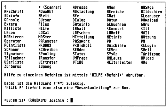 Wer aber eine Übersicht über alle ihm zugänglichen Befehle haben möchte, gibt einfach ein Fragezeichen ein, und schon erhält er eine Aufstellung. Hilfe zu den einzelnen Befehlen bekommt man, indem man HILFE plus den fragwürdigen Befehl eingibt. Alle Hilfetexte befinden sich auf dem Speichermedium, so daß jeder Sysop sie frei editieren kann.
