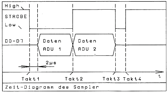 Der Sampler kann sich in vier Zuständen befinden. Die Steuerung der einzelnen Zustände erfolgt mit dem STROBE des Drucker-Ports. Das Zeit-Diagramm zeigt das Verhalten sehr anschaulich. Ausgehend von STROBE-HI, besitzen die Datenausgänge den „hochohmigen Zustand“. Der INT-Anschluß ist ein Interrupt-Ausgang und wird von den ADUs auf LOW gelegt, wenn die Messung beendet ist. So führen diese beiden Anschlüsse erst einmal HL Mit dem HI von STROBE liegt auch an den ST-Anschlüssen (durch die UND-Verknüpfung) ein HI an. Eine fallende Flanke an den ST-Anschlüssen bewirkt den Umsetzbeginn der ADUs. Diese fallende Flanke wird durch ein LOW von STROBE erreicht. Jetzt beginnen beide ADUs mit der Umsetzung. Nach ca. 2|is sind beide ADUs mit der Umsetzung fertig. Die Daten kann aber nur der ADU anlegen, der an CS und RD LOW führt. Da STROBE noch LOW und INT mit der Beendigung der Umsetzung LOW führt, legt der erste ADU seine Daten an. Jetzt heißt es Daten lesen. Ein folgendes HI von STROBE führt zu einem Rücksetzen des ersten ADUs. Damit werden die Datenleitungen hochohmig, und der INT-Ausgang geht auf HI. Der zweite ADU hat nun auch an den Anschlüssen CS und RD LOW, so daß dieser seine Daten anlegt. Jetzt heißt es wieder Daten lesen. Durch ein weiteres LOW von STROBE wird auch der zweite ADU zurückgesetzt, und die Datenausgänge werden hochohmig. Erst jetzt führt der INT-Ausgang des zweiten ADU HI, und die UND-Verknüpfung läßt nach dem nächsten HI von STROBE einen erneuten Start zu. Dieser beginnt, wie schon dargestellt, mit einer fallenden Flanke von STROBE.