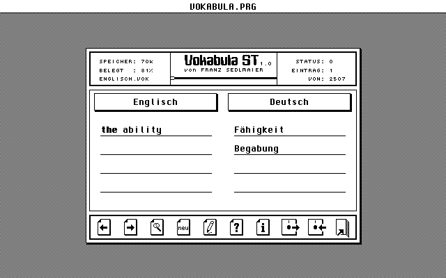 VOKABULA ST, dessen Hauptteil bereits 1989 entstand, sollte ursprünglich alle anderen bekannten Lernprogramme in Sachen Gesch windigkeit und Bedienungsfreundlichkeit schlagen. Nachdem sich die Fertigstellung immer wieder verzögerte, liegt uns nun das zigste" Vokabellernprogramm vor (Originalzitat Anleitung).