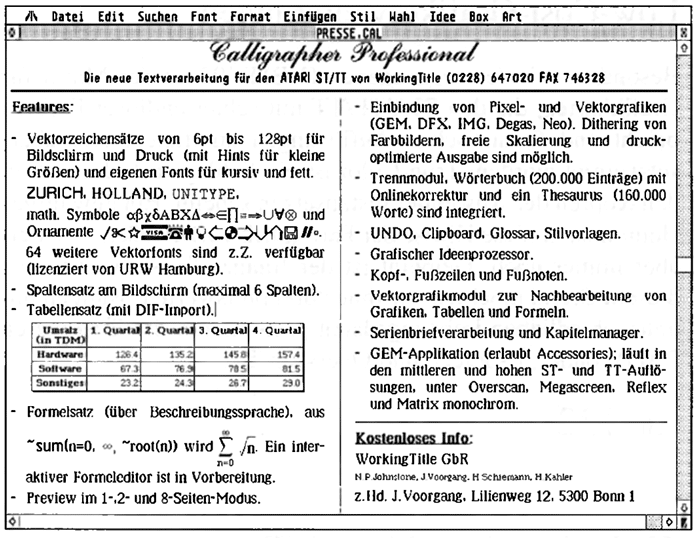 Die Firma Working Title GbR hat ab sofort die Distribution von Calligrafer übernommen. Es handelt sich um eine vollständig überarbeitete Version mit zusätzlichen Features, wie z.B. einem Thesaurus, einem Trennmodul und einer Vielzahl von lizenzierten Vektor-Fonts (URW Hamburg). Weitere Zusatzmodule befinden sich in Vorbereitung. Der Verkaufspreis beträgt 418,- DM für Calligrapher Professional, 5 Vektor-Fonts (Holland, Zürich, Unitype, Maths Symbols, Ornament), Trennmodul und Thesaurus. Altkunden von Calligrapher werden nach Einsendung der Originaldisketten automatisch und kostenlos upgedatet.