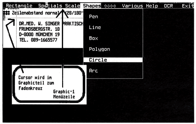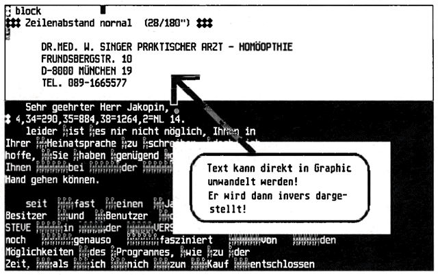 Mein Frust begann sich langsam zu legen. Leider habe ich noch nicht alle Möglichkeiten des Programmes wirklich erforschen können. Der Unterrichts- und der DTP-Teil strahlen noch immer ihre Faszination auf mich aus - aber die Zeit und die Patienten. Und dann gibt es ja auch noch den Grafikteil, die Datenübertragung (mir ein Rätsel mit sieben Siegeln), und als Option eine Schrifterkennung -nur gut, daß ich diese Version nicht auch noch vor mir habe. Die Bilder mit Beispielen aus den beiden Grafikprogrammen lassen nur dezent erahnen, welche Möglichkeit noch in dem Programm ruhen. Seit neuestem kann man auch mit den „hochwertigen“ DTP-Schriften die Grafiken beschriften!