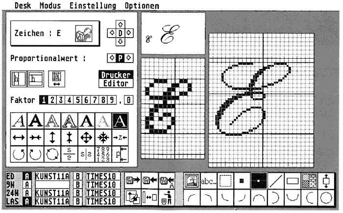 Wie Sie auf Bild 1 sehen, erlaubt SCARABUS, Fonts gleichzeitig für 9- und 24-Nadler (inkl. Bubblejets) sowie für Laser und 300-dpi-Tintenstrahler zu erstellen. Horizontale wie vertikale Hilfslinien nebst anzeigbarer Grundlinie und Horizontalbreite erleichtern die Orientierung. Als Werkzeuge stehen diverse Punkt-, Linien-und Kurvenformen zur Verfügung. Es können Ausschnitte definiert werden, die lösch-, verschieb- und veroderbar sind. So ist aus einem „b“ schnell ein „p" erstellt. Zur weiteren Arbeitserleichterung sind Bilder ladbar (ab Version 3.0 auch im IMG-Format), die buchstabenweise - auch gestaucht - in die Font-Matrix übernehmbar sind.