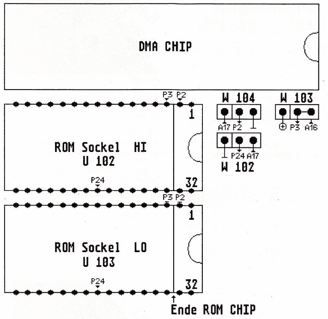 Wenn Sie die Platine alleine vor sich liegen haben, werden Sie (hoffentlich) feststellen, daß die ROM-Chips in 32poligen Sockeln stecken (auf der Platinenseite, wo die Floppy montiert war, über dem Tastaturanschluß). Rechts neben den ROMs befinden sich die Lötbrücken W102, W103 und W104 (siehe Bild 1). Falls es jemand wundert, warum an den Brücken die Adreßleitungen immer eine Nummer größer sind: Die Adreßleitungen der Sockel sind direkt mit denen des Prozessors verbunden. Allerdings hat dieser keine Adreßleitung A0, so daß seine Al mit der A0 des Sockels, seine A2 mit der A1 des Sockels usw. verbunden ist. Zurück zu den Lötbrücken: Nur W102 und W104 sind für uns interessant, W103 darf nicht verändert werden. Mit ihr könnte man anstatt des Adreßsignals A15 (A16 CPU) die Betriebsspannung 5V an Pin 3 der Sockel legen. A15 wird aber zum Adressieren des Chipinhalts benötigt, daher ist mir der Sinn dieser Brücke schleierhaft.