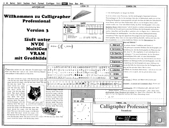 Neben spärlich bekleideten Tänzerinnen und einem Feuerschlucker zeigte man bei Digital Desktop die Textverarbeitung Papyrus, die bei manchen Funktionen schon etwas an DTP-Programme erinnert. Papyrus arbeitet rahmenorientiert und kann in allen Auflösungen betrieben werden. Es zeichnet sich vor allem durch seine Schnittstellen zu vielen anderen Programmen aus; so lassen sich Texte aus Wordplus, Signum!, Tempus Word usw. übernehmen. Überein Pop-Up-Menü lassen sich Absatzformate jederzeit abrufen, die alle Informationen über Schrift, Attribute etc. enthalten. Papyrus unterstützt diverse Font-Formate wie Signum!, GDOS etc. Bilder lassen sich einbinden, skalieren und beliebig positionieren.