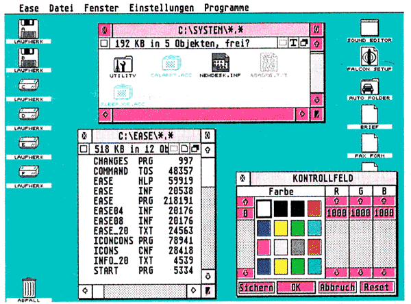 Auf dem Stand von Artifex konnte man die neue Version der Shell Ease sehen, die ab Mitte Oktober erhältlich sein wird. Ease verwendet jetzt für die Fensterverwaltung Standard-GEM-Elemente, um voll kompatibel zu MultiTOS zu sein. Ferner unterstützt sie in der neuen Version bis zu 50 Fenster. Neben diversen Änderungen dürfte es von Interesse sein, daß die Shell jetzt auch in der mittleren ST-Auflösung läuft und sich für jede Farb-auflösung eine Info-Datei abspeichern läßt. Den Icons können jetzt übrigens auch Farben zugeordnet werden.