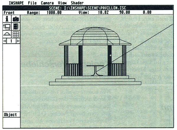 Nach der kurzen Beschreibung der Programmteile und der Handbuchbenutzung beginnt die Installation des Programms. Ein mitgeliefertes INSTALL.PRG ĂŒbernimmt das Ăberspielen auf die Festplatte, die unabdingbar ist. Hier muĂ lediglich das Ziellaufwerk angegeben werden. Nach dem Starten von InShape findet man eine GEM-Ă€hnliche Umgebung wieder. Es gibt die bekannte MenĂŒleiste, in der man einen GroĂteil der Funktionen findet. Die Bedienung erfolgt wahlweise ĂŒber Tastatur oder per Maus. Des weiteren tauchen wĂ€hrend der Benutzung des Programms auch Dialogboxen und Pop-Up-MenĂŒs auf. Leider ist dies alles nicht pures GEM, da dann ein Auflösungswechsel kein Problem wĂ€re. Aber der Autor sitzt auch schon an der Umstellung der OberflĂ€che, die im Zuge der Falcon-Anpassung geschieht. Im Handbuch folgt nun eine ErklĂ€rung ĂŒber die Bedienung diverser Dialogboxen und MenĂŒs. Dies geschieht sehr verstĂ€ndlich und ist auch fĂŒr den absoluten Neuling begreifbar. Wer nun lieber erstmal mit dem Programm spielen möchte, dem bietet das Handbuch Ăbungen an, ohne das man mit dem Programm auch nur 1 Minute gearbeitet hat. So habe ich mich auch auf diese Ăbungen gestĂŒrzt und kann es nur jedem weiterempfehlen. Es werden dort fast alle Möglichkeiten des Programms benutzt und man bekommt sehr schnell ein GefĂŒhl fĂŒr die Handhabung InShapes. Als erste Ăbung wird ein kleiner Tempel konstruiert, der aus drei Stufen, sechs SĂ€ulen, einem Dach und zwei GelĂ€ndern besteht. Dazu werden nur geometrische Formen wie KĂ€sten, Zylinder und Kugeln benutzt.