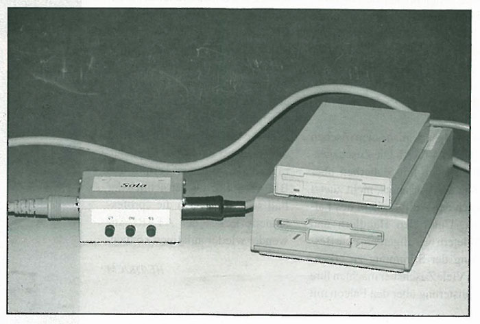 Solo kann mit zwei externen oder einem internen (1040- bzw- Mega-ST) und einem externen Diskettenlaufwerk arbeiten. Für letzteren Fall ist ein kurzes Floppy-Kabel zur Verbindung mit dem Computer im Lieferumfang enthalten. Drei Knöpfe zieren das Gehäuse von Solo. Neben dem Ein-/Ausschalter wird noch ein Taster zum Neustarten und ein Schalter benötigt, der die Auswahl zwischen ein- und doppelseitigen Disketten vornimmt. Wird Solo eingeschaltet, versucht es gleich loszulegen. Befinden sich also Disketten in beiden Laufwerken, wird sofort kopiert. Der Vorgang dauert bei einer doppelseitigen Diskette ungefähr 60 Sekunden, eine einseitige Diskette wird in ca. 40 Sekunden kopiert. Schreib- und Lesevorgang finden gleichzeitig statt. Leider gibt es keine optische oder akustische Rückmeldung, wann der Kopiervorgang beendet ist; tatsächlich kann dieser nur durch Drücken der Start-Taste oder durch Entnehmen der Disketten abgebrochen werden. Solo veranlaßt die Diskettenlaufwerke einfach immer weiterzusteppen. Es wird also nicht beim 80sten Track aufgehört. Das hat den Vorteil, daß auch Disketten mit mehr als 80 Spuren einwandfrei kopiert werden, allerdings muß der Benutzer selber darauf achten, wann die Laufwerke ihre letzte Spur erreicht haben. In der Regel macht sich dies durch ein lautes „Klack“ bemerkbar. Bei einer etwas höheren Umgebungslautstärke allerdings kann man dieses Geräusch schon einmal überhören. Dann hilft nur noch „Handauflegen“, um zu prüfen, ob die Laufwerke noch in regelmäßigem Takt steppen. Falls dies nicht der Fall sein sollte, kann man davon ausgehen, daß der Kopiervorgang beendet ist und die Disketten entnommen werden können.