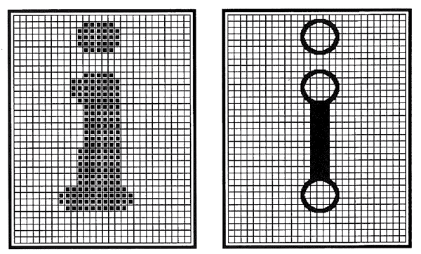 Typisches Beispiel hierzu: Das kleine ‘i’ (siehe auch Bild 2). Es hat mindestens drei markante Punkte, von denen der i-Punkt (im wahrsten Sinne des Wortes) der markanteste ist. Vom i-Punkt aus gesehen haben alle acht direkten Nachbarpunkte eine gegensätzliche Farbe, also hat dieser markante Punkt das höchstmögliche Maß an Ausprägung. Die Wahl der markanten Punkte unterliegt wichtigen Gesetzmäßigkeiten. So nimmt die Treffergenauigkeit ab, wenn zu wenige markante Punkte definiert wurden, kurioserweise ist das auch der Fall, wenn es zuviele sind. Auch sind die Lage, Entfernung und das Verhältnis der markanten Punkte zueinander zu beachten. Typische Punkte hoher Ausprägung sind End- und Eckpunkte. Punkte innerhalb von Linien eignen sich nicht als markante Punkte.