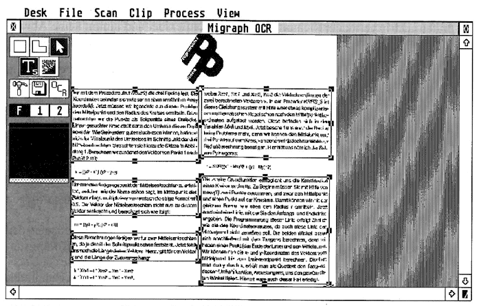 MIGRAPH OCR überläßt es also Ihnen zu entscheiden, ob Sie Textrahmen benötigen oder nicht. Wenn keine Rahmen aufgezogen sind, nimmt das Programm an, die Vorlage bestehe nur aus Text und bezieht sie komplett in den Erkennungsprozeß ein. Und diese Vorgehens weise ist sehr benutzerfreundlich, denn das pingelige Rahmenziehen dauert auch seine Zeit.