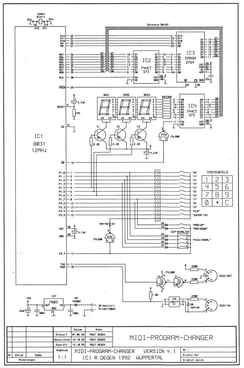 Der 8031-Mikro-Controller besitzt eine serielle Schnittstelle, die in dieser Schaltung als MIDI-Schnittstelle geschaltet wurde. Über den Optokoppler IC6 gelangen die empfangenen MIDI-Daten an den seriellen Dateneingang des Mikro-Controllers. Intern werden die empfangenen MIDI-Daten evt. mit den zu sendenden Program-Change-Codes gemischt (mergen) und über den seriellen Ausgang des Mikro-Controllers und die beiden Gatter IC5d und IC5c an die MIDI-Out-Schnittstelle gesendet. Für die Tastatur kann man einzelne Tasten oder jedes Tastenfeld verwenden, sofern es nicht als Matrix geschaltet ist. Für die Stromversorgung eignet sich ein handelsübliches 9-12-Volt-Netzteil mit ca. 150mA Ausgangsstrom, da die Schaltung des MIDI PROGRAM-CHANGERs mit einem 5 Volt-Spannungsregler versehen ist. Wenn in der Schaltung ausschließlich CMOS-ICs eingesetzt und anstatt der Siebensegment- eine LCD-Anzeige verwendet wird, kann der MIDI PROGRAM-CHANGER auch über mehrere Stunden mit einer 9Volt-Batterie betrieben werden.