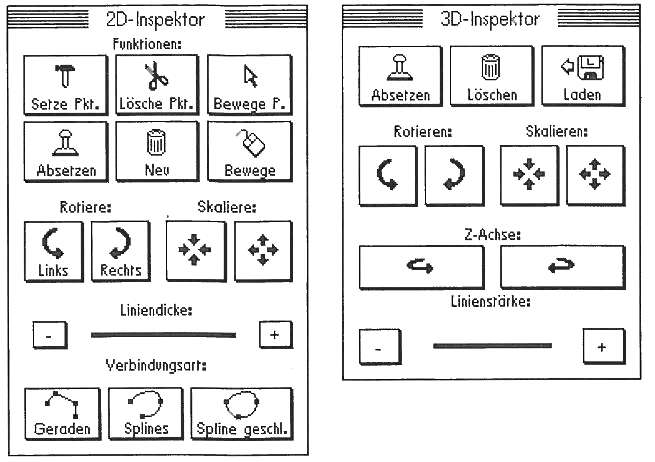 Ungewohnt üppig hingegen sind die Funktionen, welche sich dem Zeichnen von Linienzügen und Splines widmen. Der sogenannte ‚2D-Inspektor‘ bietet die Möglichkeit, entweder Linienzüge oder offene bzw. geschlossene Spline-Kurven zu zeichnen. Es lassen sich Einzelpunkte setzen, löschen und bewegen. Außerdem ist es möglich, das gesamte Spline-Objekt zu bewegen, um den Objektmittelpunkt zu rotieren und beliebig zu skalieren. Erst, wenn man mit dem Objekt rundum zufrieden ist, fügt man es per Mausklick in das Pixel-Bild ein. Eine wirklich fantastische Funktion, die das Zeichnen von unregelmäßig geformten Objekten erheblich erleichtert. Einziger Wermutstropfen: die Linienstärke läßt sich zwar beliebig variieren, jedoch - und das gilt auch für alle anderen Grafikobjekte - nicht in Verbindung mit verschiedenen Linienarten.