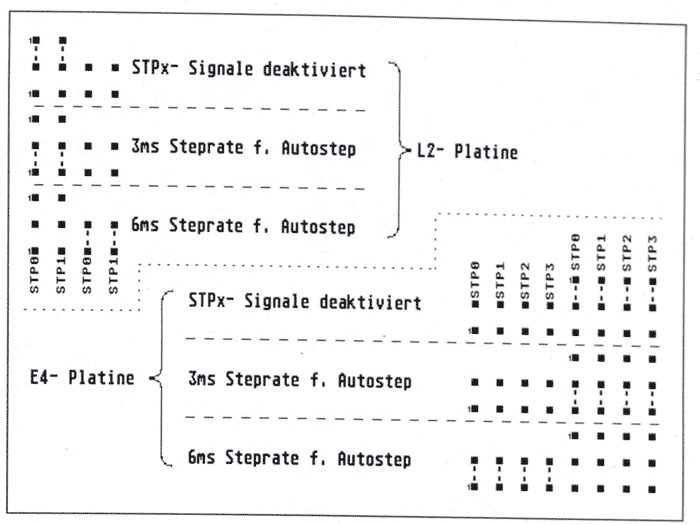 (wenn das Signal für ED z. B. an Pin 6 des Shugart-Busses anliegt, wird der EO-6-Jumper gesetzt usw.), hat man einen wunderbaren Signalabgriff und muß keine Kabel auftrennen. Die 5 V sind nur für den Pullup-Widerstand für das HD-Signa1, der in Teac-Laufwerken nicht vorhanden ist. Dieser Widerstand, R 8, kann weggelassen werden, wenn er schon auf dem Laufwerk vorhanden ist. Wenn man die Platine nicht direkt an das Laufwerk stecken möchte (die Platine ist übrigens für ein Teac-Laufwerk konzipiert), kann man anstelle von „CON 6“ auch eine gerade Stiftleiste einsetzen. Dann muß man sich jedoch mit einem kleinen Flachbandkabel behelfen, um das Laufwerk anschließen zu können. Die drei Jumper auf der Platine haben nur den Zweck, die Signale, die von den Pins 2, 4 und 6 des Shugart-Busses kommen oder abgehen, vom restlichen Bus zu trennen, damit sie sich nicht gegenseitig stören. Wenn man die HD-und ED-Signale z. B. auf den Pins 4 und 6 ausgibt, öffnet man einfach JP 12 und JP 13. Auf dieser Platine werden übrigens alle Bauteile auf der Bestückungsseite bestückt. Zur Isolierung des ganzen ist eine untergeklebte Pappe sehr gut. Die entsprechenden Anschlüsse von „CON 8“, einer Stiftleiste, kann man über eine Buchsenleiste und mit etwas Kabel sehr gut mit den entsprechenden Pins von „CON 4“ auf den Modulen verbinden. Nachdem man nun das Laufwerk richtig gejumpert, richtig angeschlossen und sorgfältig die Signale mit dem Modul verbunden hat, jumpert man das Modul, also den Autostep und die Eingangssignale für das Laufwerk korrekt (sind die HD-und ED-Signale active high oder active low?) und wagt den ersten Testlauf noch im fliegenden Aufbau (Vorsicht vor dem Netzteil, an den Bauteilen liegen Hochspannungen an!). Wenn der Rechner jetzt mit einer DD-Diskette bootet, hat man das Gröbste hinter sich. Bootet er nicht, wenn das Laufwerk angeschlossen ist, überprüft man noch einmal, ob alle Leitungen und Jumperungen korrekt sind. Falls das Modul vorher, ohne Laufwerk, lief, kann es nur an der Verkabelung liegen. Falls es partout nicht funktioniert (haben Sie vielleicht nur den Floppy-Stecker falsch herum eingesetzt?), können Sie sich noch an den Autor (Adresse u. Telefon siehe unten) oder die Redaktion der ST Computer wenden.