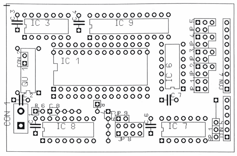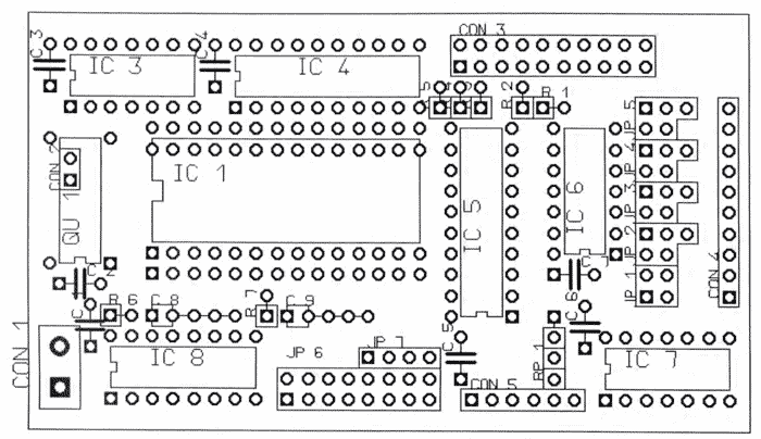 Um auch hierbei eine Normierung des ganzen zu erreichen, sollte das HD-Signal an der Spitze, das ED-Signal an dem Teil dahinter und Masse am Rest der 3,5-mm-Klinkenbuchse anliegen. Mit dieser Methode sollte es kein Problem sein, auch einen 520 mit zwei ED-Laufwerken zu betreiben (aber warum?). Noch etwas zu den Modulen. Es kann passieren, daß die Abblockkondensatoren nicht auf die Bestückungsseite passen, weil die Fassungen oder ICs im Weg sind. Dann kann man die Kondensatoren auch auf der Lötseite bestücken und umbiegen (dabei auf Kurzschlüsse achten!). Für "CON 3" sollte auch unbedingt eine Buchsenleiste (am besten mit Präzisionskontakten für eckige Stifte) verwendet werden, da hier 5 V und Masse anliegen. Die E2-Platine sollte mit Pappe auf der Lötseite isoliert werden, da die Fläche auf der Unterseite 5 V führt und es sonst leicht zu Kurzschlüssen mit den Jumpern kommt. Die Widerstände werden alle in der in Abb. 11 gezeigten Weise bestückt. Den Pin 1 des Quarzoszillators erkennt man übrigens am Punkt auf der Oberseite oder an der spitzen Ecke (alle anderen Ecken sind abgerundet!). Die Platinen müssen übrigens durchkontaktiert und mit drei verschiedenen Bohrdurchmessern gebohrt werden. Die Durchkontaktierungen werden mit 0,6mm, die kleinen Pins mit 1,0mm und die großen Pins von "CON 1" mit 1,4mm gebohrt.