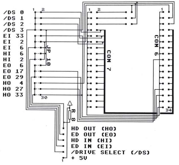 Doch nun zum wichtigsten, den Eingangssignalen. Diese Eingangssignale, also die /Drive Select-(/DS), ED-und HD-Signale, werden bei allen Modulen an „CON 4“ angeschlossen, wie in Abb. 9 zu sehen. Die /DS-Signale sind alle numeriert. Diese Nummern sind nur als Anschlußhilfen gedacht, also gehören z. B. /DS0, STP0 (s. oben und Abb. 12), HD0 und ED0 zusammen und müssen nicht zwangsweise vom Laufwerk kommen, das das /DS auf 0 gejumpert hat, sondern nur von ein und demselbem Laufwerk (bis auf STPx, das ja auf dem Modul erzeugt wird). Die HD-und ED-Signale werden durch einen 74LS04 invertiert, wenn man z. B. die in [3] beschriebene HD-Erkennung für 5 1/4“-Disketten benutzen möchte. Deshalb liegen diese invertierten Eingangsignale auch an „CON 4“ wieder an. Sie werden auch dann im Modul intern verwendet, wenn man, aus welchem Grund auch immer, die HD-oder ED-Signale active low definiert hat, damit durch entsprechendes Jumpern von „JP 2-5“ (Abb. 13) das Modul funktioniert. Die entsprechenden Signale werden dann über die Jumper den GALs zugeführt. Die an den GALs (egal welchen) anliegenden HD-und ED-Sinale sind immer active high (s. Listings für GAL 16A und 20C). Die /DS-Signale (7 bedeutet übrigens, daß das Signal active low ist!) können über „JP 1“ inaktiviert werden. Das Inaktivieren ist dann notwendig, wenn ein Signal nicht benötigt wird, z.B. dann, wenn ein HD-Laufwerk angeschlossen wird, in diesem Fall muß das ED-Signal inaktiviert werden (s. Abb. 13). Falls eine Anschlußgruppe (/DSx, HDx und EDx) nicht benutzt wird, müssen alle diese Signale inaktiviert werden.