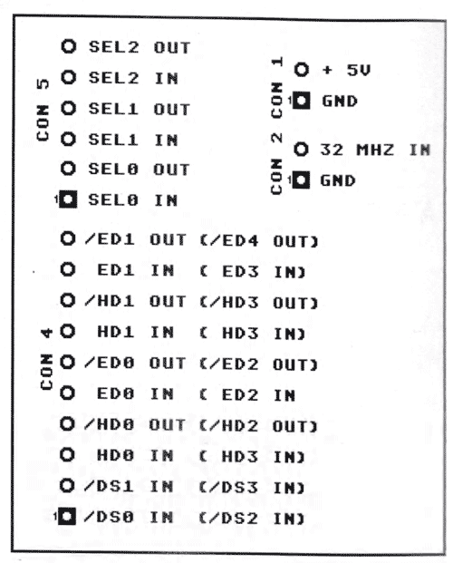 Der Takt, der entweder vom Quarzoszillator auf dem Modul erzeugt oder über "CON 2" (Pin-Belegung siehe Abb. 9) von der Hauptplatine eingespeist wird, wird direkt an das entsprechende GAL weitergeleitet und nebenbei durch zwei D-Flipflops, die in einem 74LS74 integriert sind, auf 16 MHz und 8 MHz heruntergeteilt, wie in [2) beschrieben und in [3] angewendet. Eine genaue Beschreibung der Funktionsweise der Flipflops würde hier zuviel Platz beanspruchen, sie ist aber auch nicht notwendig. Diese beiden anderen Taktleitungen sind ebenfalls, wie der 32-MHz-Takt, an das entsprechende GAL angeschlossen. Zur „Weiterverarbeitung“ dieser Signale später mehr. Wenn die externe Signalzuführung über „CON 2“ benutzt wird, darf der Quarzoszillator natürlich NICHT bestückt werden (sonst gibt’ s Chaos)!