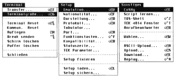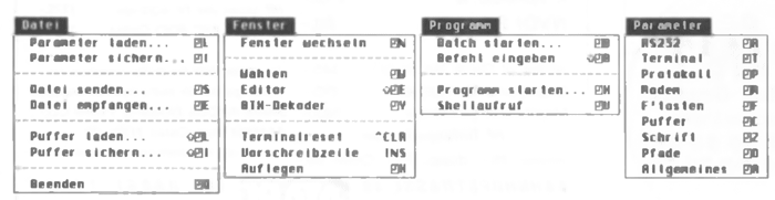 Anhand der abgedruckten Menüleiste bekommen Sie einen guten Eindruck von dem, was Rufus zu leisten vermag: Selbstverständlich können die Funktionstasten frei belegt, normale Programme nachgestartet und der im Terminal- und Wählfenster benutzte GDOS-Font eingestellt werden. Die Benutzer einer Shell können von Rufus aus auch auf diese zurückgreifen (‚Shell starten‘).