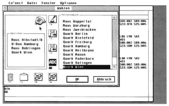Connect ist wohl der jüngste Vertreter im Terminal-Genre und dementsprechend mit dem ausgestattet, was derzeit als „der letzte Schrei“ gilt. Connect legt seine Dialogboxen in ein Fenster und besitzt auch kein eigenes Desktop. Damit können alle Features einer Multitasking-Umgebung mit Connect voll ausgeschöpft werden. Menüeinträge sind, wie bei allen der hier vorgestellten Programme, über Short-Cuts erreichbar, die sich allerdings vom Anwender frei definieren lassen. Connect kann in maximal vier Fenstern auch vier Schnittstellen (quasi) gleichzeitig bedienen. So können Sie sich beispielsweise auf einem TT, der ja bekanntlich mehrere serielle Schnittstellen besitzt, in zwei Mailboxen gleichzeitig herumtreiben (natürlich nur, wenn Sie auch zwei Modems besitzen, hüstel). Besitzer eines Großbildschirms können Dialoge um die aktuelle Mausposition herum zentrieren lassen, so daß ein ständiges Hin- und Herfahren mit der Maus erspart bleibt. Darüber hinaus sind die Dialoge durchgängig über die Tastatur bedienbar (ähnlich den Fly- oder Mydials). Da nun jeder Anwender den Schwerpunkt bei dem legt, was er subjektiv als „gute Bedienbarkeit“ bezeichnet, kann ein Großteil der eben beschriebenen Features auch optional abgeschaltet werden. Wer also die Dialoge in der Mitte des Bildschirms und nicht in einem (frei verschiebbaren) Fenster haben möchte, ist somit auch bestens bedient.