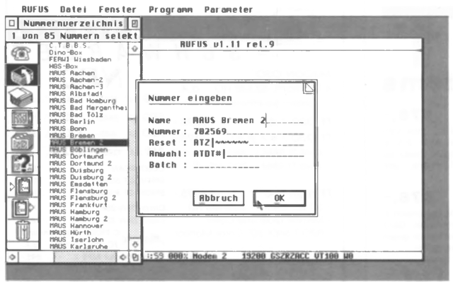 In der nicht mehr ganz neuen Version 1.11R9 (die 1.20 ist in Arbeit) von Rufus sind alle Funktionen vorhanden, die auch den anspruchsvolleren User zufriedenstellen dürften. Neben den wichtigsten Übertragungsprotokollen wie X-, Y- und ZMODEM sind auch ein kleiner (für das Gröbste ausreichender) Texteditor und ein Wählverzeichnis vorhanden, in dem eine nahezu unbegrenzte Anzahl von Mailboxen eingetragen werden kann. Wichtig ist auch die Möglichkeit, jeder Box-Nummer die Geschwindigkeit der seriellen Schnittstelle, ein Dialprefix und eine bei erfolgreich aufgebauter Verbindung auszuführende Batch-Datei zuordnen zu können. Das erhöht die Flexibilität im Alltag doch erheblich.