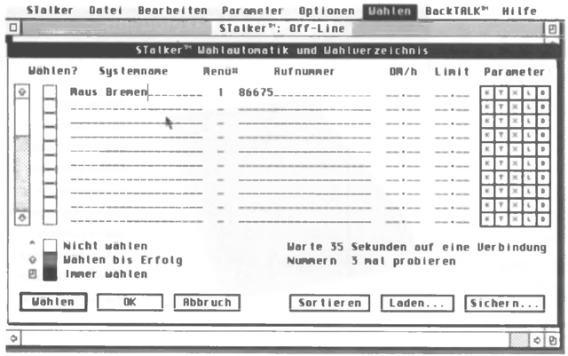 In der Nummernliste können für jeden Eintrag alle einstellbaren Parameter mit gespeichert werden. Natürlich lassen sich mehrere Nummern selektieren, die dann der Reihe nach angewählt werden, bis eine Verbindung zustandekommt. Des weiteren stellt STalker einen Gebührenzähler zu Verfügung, was sich in der Praxis als sehr nützlich erwiesen hat.