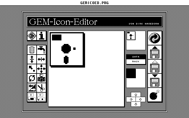 Nach dem Start melden sich die Editoren mit einer Dialogbox, die alle Bedienungsfunktionen stilgerecht in Piktogrammform präsentiert. Neben vier Feldern in denen Daten und Maske jeweils zur Bearbeitung vergroßert und in Originalgroßer dargestellt werden, finden sich hier neben dem obligatorischen Info-Knopf die Funktionen zum Laden, Speichern und Mischen, sowie eine ganze Reihe von mehr oder weniger sinnvollen Bearbeitungsfunktion. Sehr nützlich ist hingegen die Vorschau, mit der sich das gerade in der Vollendung befindliche Icon auf weißem und grauem Hintergrund betrachten läßt, womit sich so schnell Maskenfehler finden lassen.