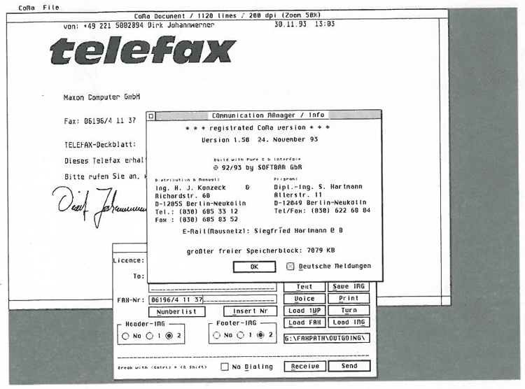 Nachdem die ersten Versuche mit dem Versenden erfolgreich verlaufen sind, soll nun auch das Empfangsteil von CoMa auf Herz und Nieren gecheckt werden. Das Empfangsteil von CoMa stellt sicher das Sahnestück dieses Programms dar. Um FAXe zu empfangen, gibt es grundsätzlich zwei Möglichkeiten: Entweder wird CoMa als Accessory installiert und kann dann automatisch auf eingehende Anrufe anspringen, oder aber man wählt im Hauptdialog, nachdem man einen Anruf als FAX-Anruf erkannt hat, manuell den Button „Receive“ an. CoMa bietet beim Empfang ein paar Features, die bisher so bei den gängigen FAX-Programmen nicht vorhanden waren: So wird auf Wunsch das FAX direkt während des Empfangs online auf dem Bildschirm angezeigt oder auf einem angeschlossenen Drucker ausgegeben. So kann man bereits während der Übertragung erkennen, ob eine FAX-Seite ordentlich übertragen wurde oder ob die Übertragung aufgrund von Leitungsstörungen besser abgebrochen werden sollte. Ist ein FAX einmal empfangen worden, muß es in der Regel zu Papier gebracht werden, sofern dies nicht direkt während des Empfangs bereits geschehen ist. CoMa bietet hier, neben der direkten Unterstützung von HP-Laserjet-kompatiblen Druckern, auch den Druck über einen GDOS-Druckertreiber an, so daß jeder Drucker, für den es einen GDOS-Treiber gibt, auch mit CoMa zusammenarbeitet. Zur Auswahl stehen außerdem zwei Ausgabeformate, die ein FAX entweder auf die ganze Seite verteilen, was sich für Texte empfiehlt, die dadurch besser lesbar werden, oder in der originalen Druckerauflösung ausdrucken, was bei einem Laserdrucker zwar ein kleineres, dafür aber qualitativ besseres Druckergebnis zur Folge hat. Außerdem lassen sich die FAXe von CoMa als IMG-Files abspeichern.