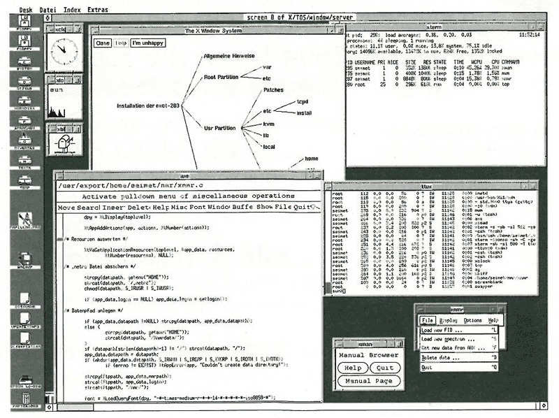Nun ruft man das Server-Programm auf, das als Applikation oder Accessory eingesetzt werden kann. Es empfiehlt sich, den Server so zu konfigurieren, daß er sich über das XDMC-Protokoll bei einer oder mehreren Maschinen im Netz meldet und deren Login-Dialog darstellt. In diesem Fall durchläuft man die unter Unix übliche Login-Prozedur, und nach einer kurzen Wartezeit für das Starten des Window-Managers ist man auf der X-Ebene angelangt. Wurde der X-Server auf dem ATARI als Applikation im Vordergrund gestartet, obliegt die gesamte Verwaltung des ATARI-Bildschirms nun dem Server, der die von der Workstation gelieferten Grafikinformationen auf dem ATARI umsetzt. GEM ist in diesem Fullscreen-Modus nicht mehr aktiv. Beim Betrieb als Accessory kann der Server mehrere Bildschirme (Screens) bedienen, die sich jeweils in einem eigenen Fenster befinden, aber auch jeder für sich im Fullscreen-Modus genutzt werden können. Es werden maximal 10 solcher Screens unterstützt, die wechselseitig betrieben werden können, falls nicht genügend Fenster zur Verfügung stehen. Unter WINX können alle Screens gleichzeitig angezeigt werden. Gegenüber dem Fullscreen-Betrieb ist die Darstellung in Fenstern mit Geschwindigkeitseinbußen verbunden, da die Verwaltung von Fenstern naturgemäß einen erhöhten Rechenaufwand für Redraws mit sich bringt. Der X-Server ist in der Lage, Screens zu verwalten, die größer als der physikalische Bildschirm sind. In diesem Fall wird der sichtbare Bildausschnitt automatisch verschoben, sobald die Maus den Bildrand erreicht. Da das X-Window-System erst auf großen Bildschirmen richtig zur Geltung kommt, ist dieses Leistungsmerkmal vor allen Dingen für die Besitzer normal großer Monitore nützlich, da sich hierdurch der Nachteil eines kleinen Monitors teilweise auffangen läßt.