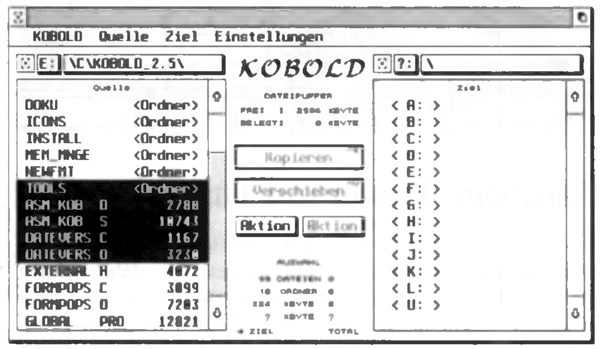 Vom Hochleistungs-Dateikopierer Kobold gibt es nun die neue Version 2.5. Zahlreiche Verbesserungen erleichtern insbesondere die Bedienung und erhöhen die Funktionsvielfalt. Die Laufwerksschnellauswahl und die zentralen Aktions-Pop-Ups sorgen für eine beschleunigte Handhabung, die verbesserte Speicherverwaltung und die deutlich effizientere Verzeichnisverwaltung bescheren eine erhöhte Kopierleistung. Durch Ausnutzung spezieller, unter MultiTOS und MagiX! 2 verfügbarer Funktionen wurde hier sogar eine weitere Steigerung der Arbeitsgeschwindigkeit erreicht. Unter MultiTOS kann Kobold durch ein mitgeliefertes Zusatzprogramm direkt die Kopieraktionen des Desktops übernehmen. Die Jobsprache wurde um zahlreiche neue Befehle erweitert und erlaubt nun auch die Programmierung von Schleifenkonstrukten. Laufwerksvariablen erlauben komplexe Jobs mit Benutzerinteraktion. Jobs können nun auch direkt über die Funktionstasten gestartet werden. Die Formatierroutinen wurden um die vielfach gewünschte Schnellformatierung unformatierter Disks (zweiseitige DD in 35s) und die echte Hintergrundformatierung erweitert. Registrierte Anwender wurden über Update-Möglichkeiten informiert. Wer seine Registrierkarte noch nicht eingesandt hat. kann dies nachholen und erhalt dann automatisch die Update-Informationen. Kobold 2.5 kostet 139,- DM