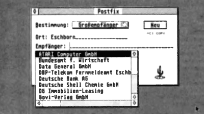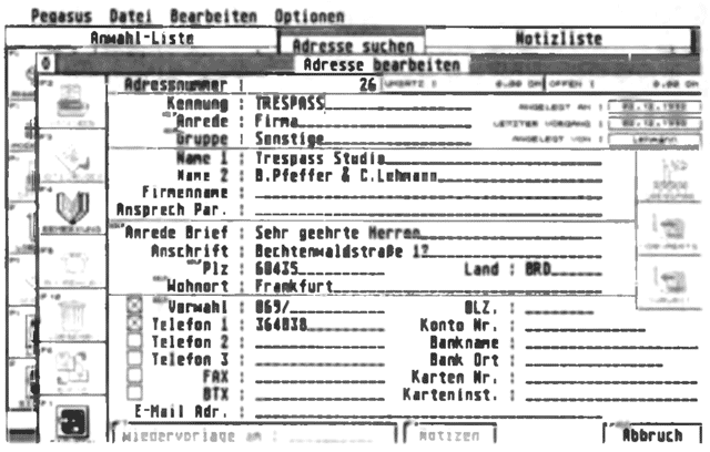 Die Adressenverwaltung Pegasus ist um zahlreiche neue Funktionen erweitert worden MTOS Drag & Drop Protokoll. Anwahlliste mit Anwahl im Hintergrund über Modem, Notizeditor, Notizliste, Import, Übergabe viva Tastaturpuffer usw. Außerdem ist die Firma Pergamon Software umgezogen. Hier die neue Adresse: