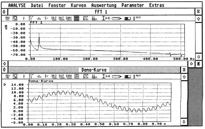 Ein äußerst wichtiger und - wie wir meinen - hervorragend implementierter FFT-Algorithmus erlaubt die Fast-Fourier-Transformation zur Frequenzanalyse von Signalen. Beim Einsatz des Programms auf einem Falcon übernimmt der interne DSP die Berechnung der FFT per externem LOD-File, wobei das Programm automatisch - für den Anwender unbemerkt - den DSP konfiguriert (Begrenzung auf 2048 Stützstellen). Grundsätzlich besteht bei der FFT mit rho-Analyse die Möglichkeit. die Ausgabe nach Betrag (in db), Phase, Real- und Imaginärteil aufzuteilen, wobei der Gleichspannungsanteil ausgeblendet werden kann.