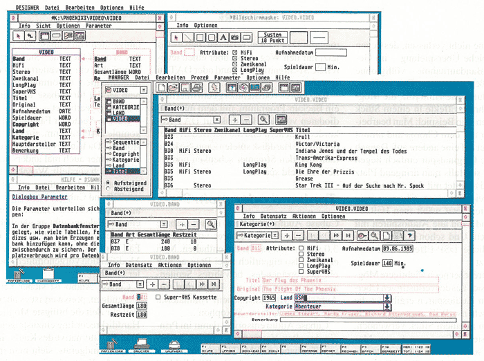 So schmücken jene bunten Icons nun auch die Oberfläche der neuesten Version von „Phoenix“. Ein weiteres Indiz für die von Application Systems angestrebte Klientelerweiterung (vom Profi hin zum Laien) ist der „Quick-Guide“ im Handbuch: Auf knapp 50 Seiten (von insgesamt 350) wird sehr anschaulich ein Schnellkurs in die Datenbankanwendung anhand eines ein fachen Beispiels beschrieben.