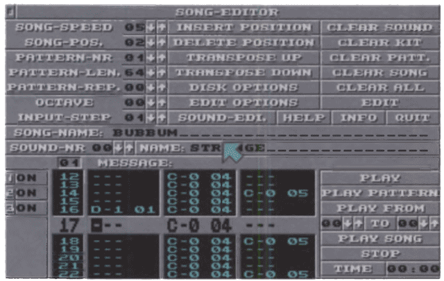 Eine der wichtigsten Funktionen von SOUND BUSTER ist der Ablaufplan, mit dem man wie in einem Baukasten ein Musikstück zusammenbastelt. Er bestimmt, in welcher Reihenfolge die bis zu 64 Sequenzen abgespielt werden. Der Ablaufplan besteht aus maximal 100 Positionen, und für jede Position kann eine Sequenz und deren Wiederholung eingestellt werden. Der Ablaufplan wird indirekt im oberen linken Drittel des Song-Editors angezeigt. Die Variable SONG-POS gibt die aktuelle Position im Ablaufplan an, die Variable PATTERN-NR enthält dann die Nummer der Sequenz, die an dieser Position gespielt werden soll. Zwei waagerechte Striche (—) kennzeichnen das Ende des Ablaufplans. Die Variable PATTERN-REP legt die Wiederholung einer Sequenz fest. SOUND BUSTER bietet drei verschiedene Möglichkeiten zum Abspielen an: Entweder wird nur das gerade bearbeitete Pattern oder der komplette Song gemäß dem Ablaufplan abgespielt. Alternativ kann auch nur ein Teil des Songs angespielt werden. Mit zwei Variablen kann man die Start- und die Endposition festlegen.